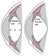 In a youthful eye, the lens is supple and elastic and when a person focusses at a close range the siliary muscles on the outside contract, causing the lens to become rounder. With the aging process the lens becomes less flexible, thus when the siliary muscles contract, the lens does not become as round and therefore focussing at close range is harder.